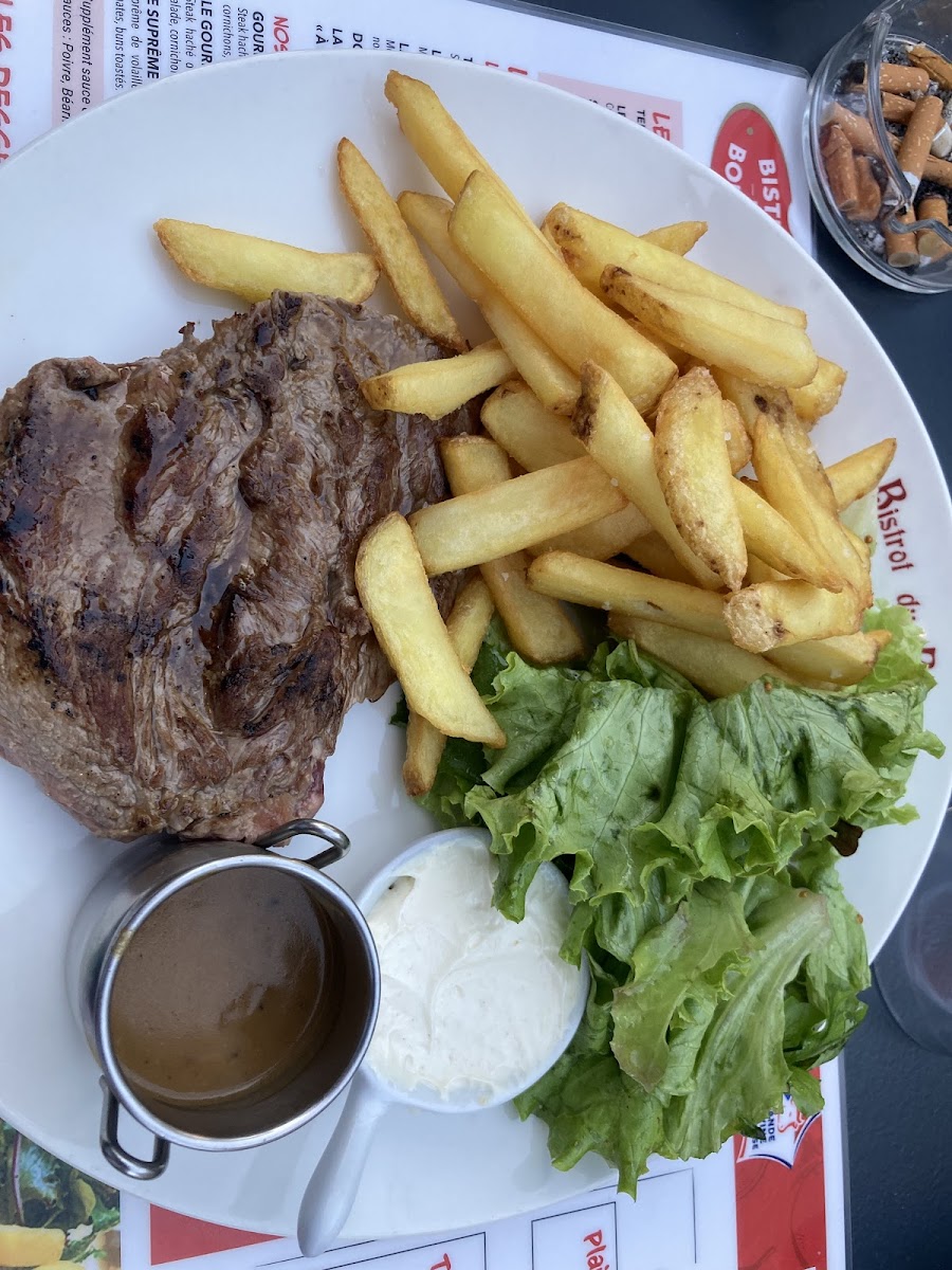 We were pleasantly surprised with a delicious meal of beef tartare, a gourmet burger and a charcuterie plate. Wine is served in ‘real’ wine glasses. Excellent service. They even searched for menus in English. Definitely recommend.